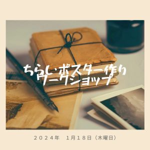 <ワークショップのおしらせ> 1月18日(木曜日) 荒木コーディネーターによる ちらし・ポスター作り ①10:00~12:00 ②14:00~16:00 ※パソコン(パワーポイント)を持っている方 ※材料費300円 新年 […]