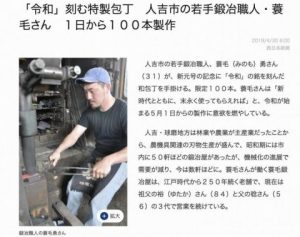 こんにちは! 人吉しごとサポートセンターです。 ヒットビズにて応援させていただいている蓑毛鍛冶屋10代目の蓑毛勇さん 新元号「令和」に合わせた記念包丁の作成を決定し、300件近くのお問合せ・お申込みがあったそうです!※応 […]
