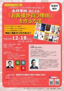 概要 開催日時:2018年12月18日 18:30 – 22:00 開催場所:人吉商工会議所 〒868-0037 熊本県人吉市南泉田町3−3 数々のビジネス書ベストセラーを輩出したマーケティング戦略コンサルタント永井孝尚 […]